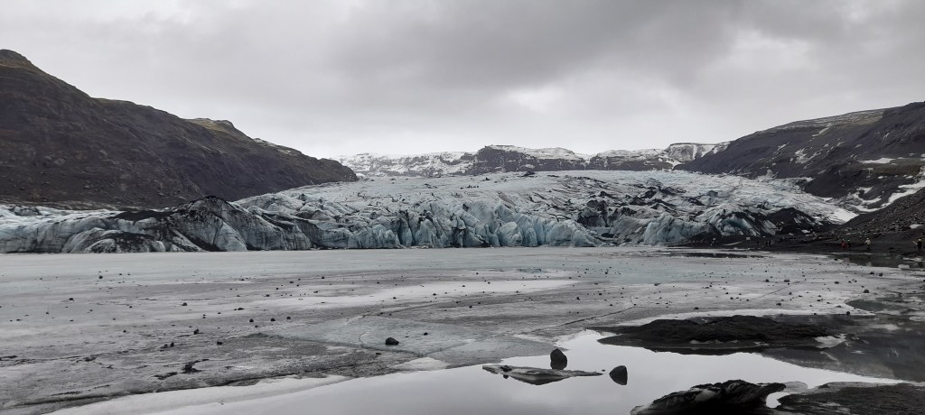 As suggested by its name, large swathes of Iceland are covered in ice. Most of it lies within huge icecaps on the mountainous interior of the island, but narrower tongues of ice seep out around the edges, draining the higher elevations. One of the most accessible glaciers is Sólheimajökull, only a couple of hours from Reykjavik. It creeps down from the icecap over Katla – a huge volcano with a history of violence. Sadly, the scale of this glacier is lost on a tiny phone photo, and it’s the scale that really blows your mind. If you look closely, there are tiny people standing on the ice – but it’s still hard to convey.