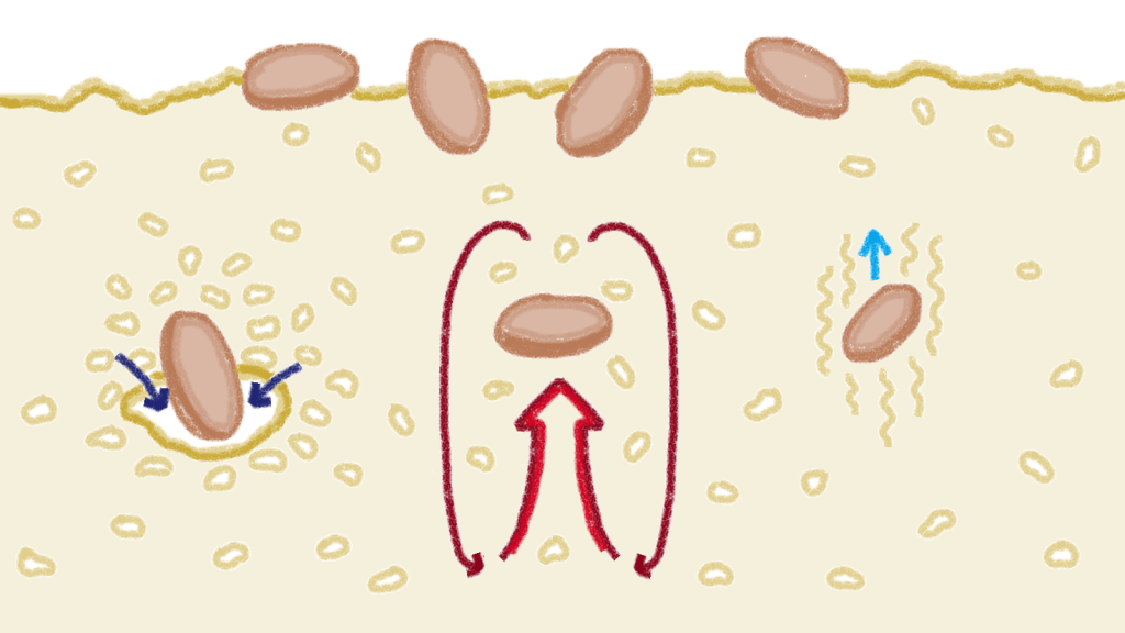 The same dilatant behaviour of granular suspensions can also lead to them forming a heap of their own accord when their container is shaken. Particles become more concentrated and interlocked with increasing depth into a suspension, and so any slight variation from a flat surface leads to lateral concentration gradients. Areas beneath bumps are more compressed, while areas within dents are less so. Thanks to the dilatant behaviour, the least compressed areas are more mobile, as they can expand and unlock more easily. We end up with a net migration of particles away from the most mobile regions, leading to the particles concentrating towards bumps in the surface, essentially making mountains out of molehills. This is very strange behaviour indeed – and is similar to our Brazil nut effect in that it feels counterintuitive at first.