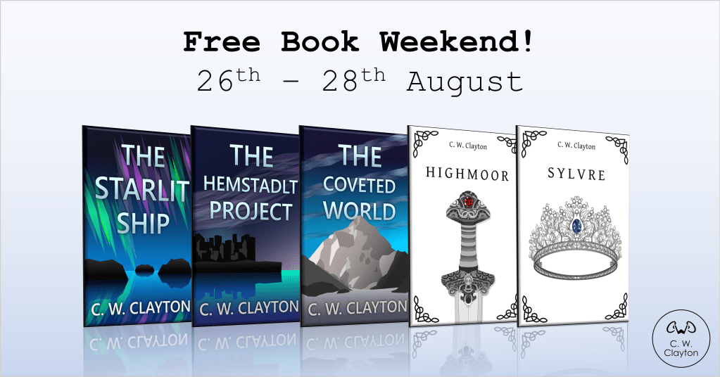 Hello readers! This weekend, all my books will be FREE on Amazon (find them here). My first trilogy, The Starlit Ship, is a science fiction thriller that explores the environmental and political fallout after a giant ship arrives unexpectedly in the upper atmosphere. The first two books of my second series, Highmoor, will also be available. These are high fantasy novels, following the adventures of three brothers caught up in a bloody conflict between two nations bordering their forest home. It has political scheming, an intricate magic system, non-conventional witches and mind-reading dragon, so if any of that piques your interest, make the most of the free book weekend! Oh, and because it’s a bank holiday here in the UK, you get a bonus free book day on Monday. Happy reading!