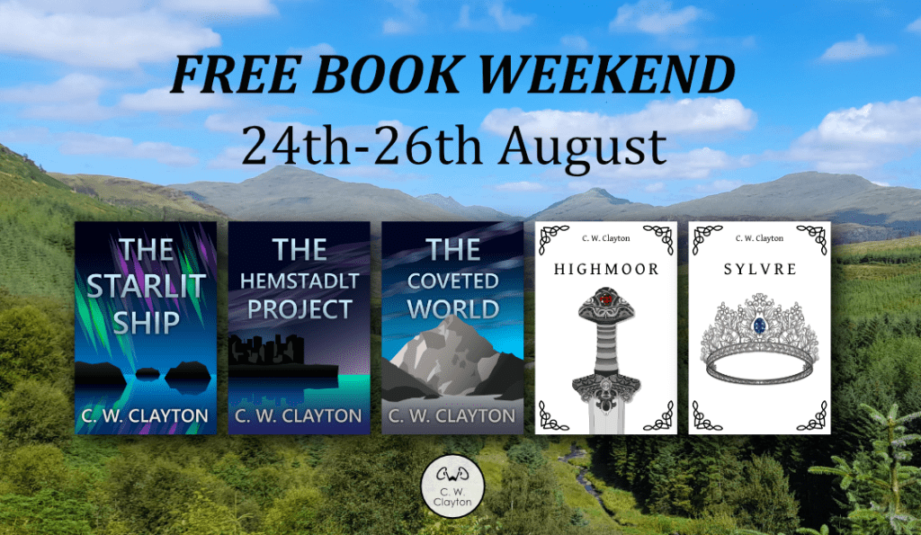 Hello readers! From Saturday to Monday, my first five books will be FREE on Amazon (find them here). The Starlit Ship trilogy consists of three science fiction thrillers set in the far future on a distant planet, centuries after it was colonised by humans. These books explore the environmental and political consequences of a giant, unexplained ship arriving in orbit. I also have a second series, Highmoor, which is traditional high fantasy. The first three books are now out (with the final instalment in progress), and they follow the adventures of three brothers caught up in a conflict between the nations bordering their forest home. It has political scheming, an intricate magic system, non-conventional witches and mind-reading dragons, so if any of that piques your interest, make the most of the free book weekend!