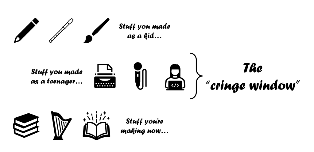 The cringe window exists somewhere between your childhood and the present day. Think of the most embarrassing song, short story, or poem you ever wrote, and that will probably fall within a cringe window which contains other questionable works. If you don’t have any embarrassing work, then great! I wish I had your self-confidence. Just humour me as I try to explain myself.